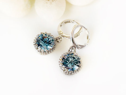 Halo blue topaz lever back earrings, classic halo blue & white gemstone earrings, gift for her, gift for mom, December birthstone earrings