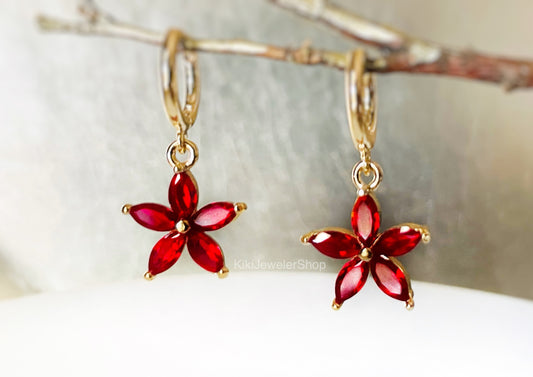 Garnet flower dangle earrings in 14k gold, red garnet flower drop earrings, January birthstone earrings, gift for mom, gift for her