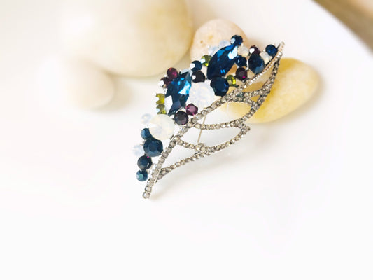 Antique silver crystal leaf brooch pin, multi blue crystal brooch, clustered crystal brooch, gift for her, gift for mom