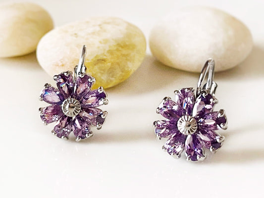 Amethyst flower dangle earrings, purple gemstone daisy flower earrings, February birthstone earrings, gift for mom, gift for her