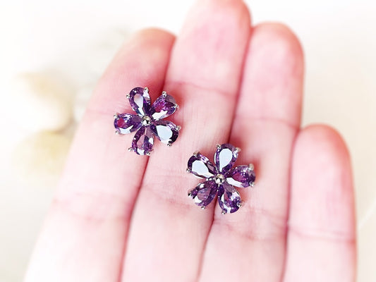 Amethyst flower stud earrings white gold, purple dangle gemstone flower earrings, gift for her, gift for daughter, February birthstone