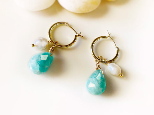 Natural amazonite teardrop pearl dangle earrings gold, blue green teal gemstone drop earrings, gift for mom, gift for her