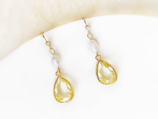 Pale yellow crystal pearl long dangle earrings gold, light yellow crystal pearl bridal earrings, gift for her, November birthstone,
