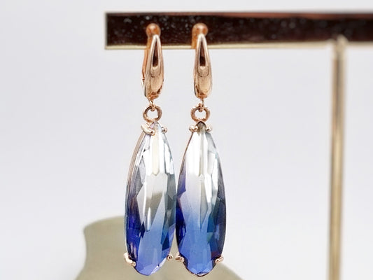 Large pear shaped gradient sapphire blue crystal dangling earring in 14K rose gold, gift for her, gift for mom
