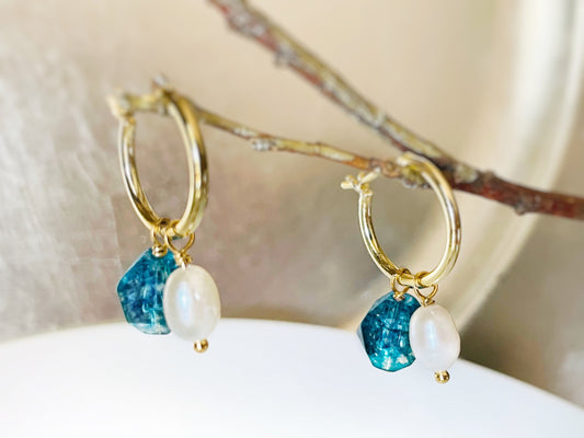 London blue topaz pearl gold hoop earrings, handmade natural dark blue gemstone earrings, gift for her, gift for mom, December birthstone