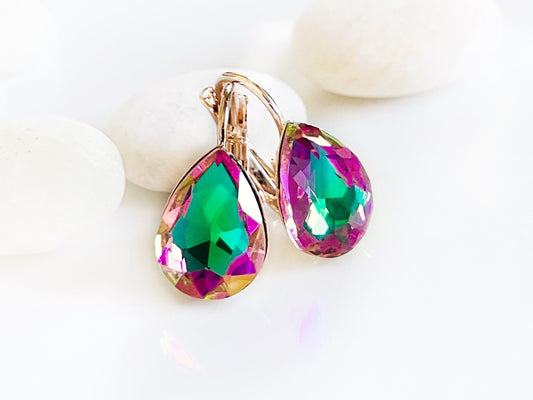 Pink green Fancy crystal Stud earrings, solitaire lever back studs, fancy crystal teardrop, gift for mom, bridal earrings