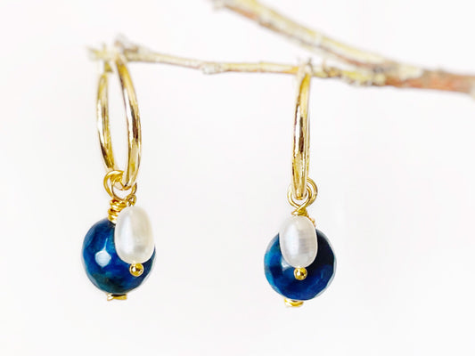Lapis lazuli pearl gold hoop earrings, handmade natural gemstone pearl earrings, gift for her, gift for mom