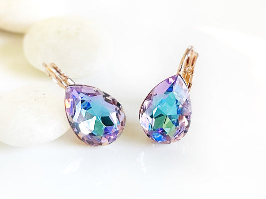 Mystic amethyst crystal teardrop earrings, lavender blue color earrings, fancy crystal studs, gift for mom, gift for her