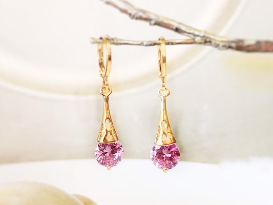 Pink sapphire filigree dangle earrings, small pink gemstone drop earrings, gift for her, gift for daughter, October birthstone