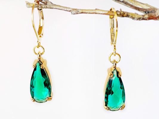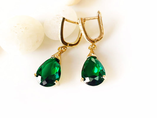 Teardrop emerald drop earrings, green gemstone drop earrings, green crystal bridesmaids earrings, gift for her, gift for mom, May birthstone
