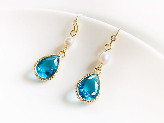 Teardrop blue topaz pearl long dangle earrings gold, blue pearl bridal earrings gold, bridesmaid earrings, gift for her, December birthstone