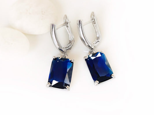 Emerald cut sapphire dangle earrings, blue gemstone earrings, gift for her, gift for mom, September birthstone