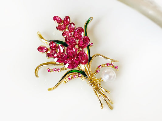 Large pink floral pearl crystal brooch gold, deep pink flower brooch pin, wedding statement bouquet brooch, gift for her, gift for mom
