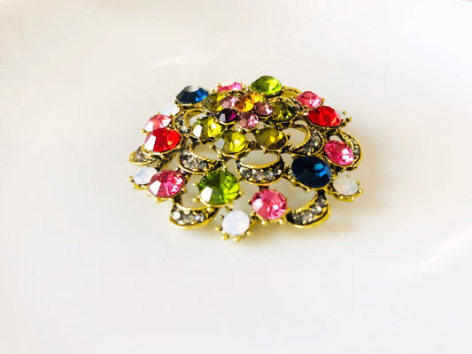 Multicolored red green crystal bouquet brooch, antique gold rainbow crystal bouquet brooch, gift for her, gift for mom
