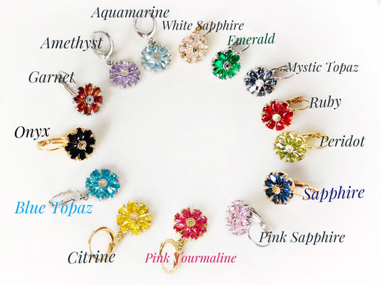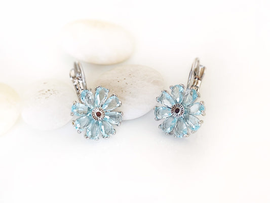 Blue topaz daisy leverback earrings, blue gemstone flower earrings, December birthstone earrings, gift for mom, gift for her