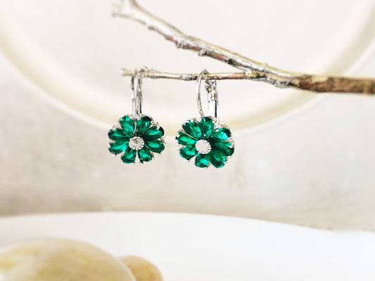 Emerald flower dangle earrings, green daisy flower drop earrings, May birthstone earrings , gift for mom, gift for her