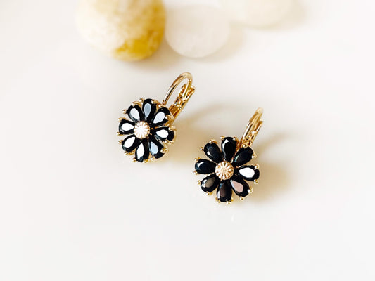 Onyx daisy gemstone earrings, black gemstone flower gold earrings, small daisy flower leverback earrings, gift for mom, gift for her
