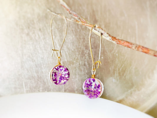 Purple fresh flower ball dangle earrings, fresh dried flower resin ball drop earrings, gift for mom, gift for her