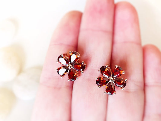 Garnet flower stud earrings rose gold, red gemstone flower studs, gift for her, gift for mom, January birthstone