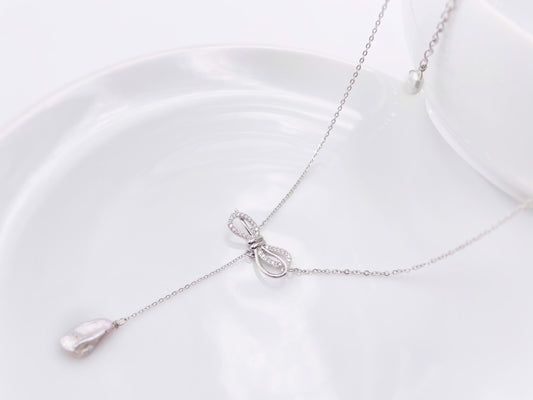 Baroque pearl lariat necklace in 18K white gold filled, statement pearl lariat necklace, gift for her, gift for mom