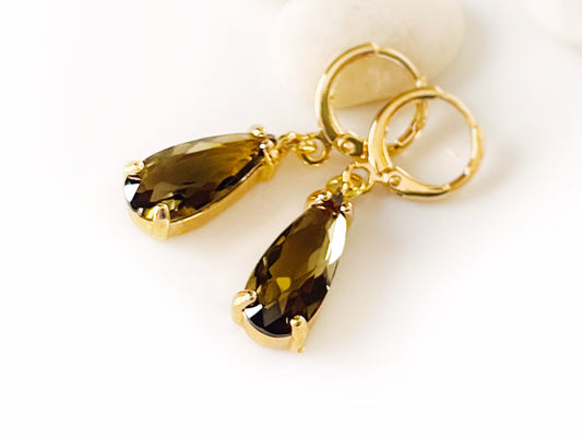 Teardrop peridot gemstone dangle earrings gold, elongated olive green gemstone gold, gift for her, august birthstone earrings