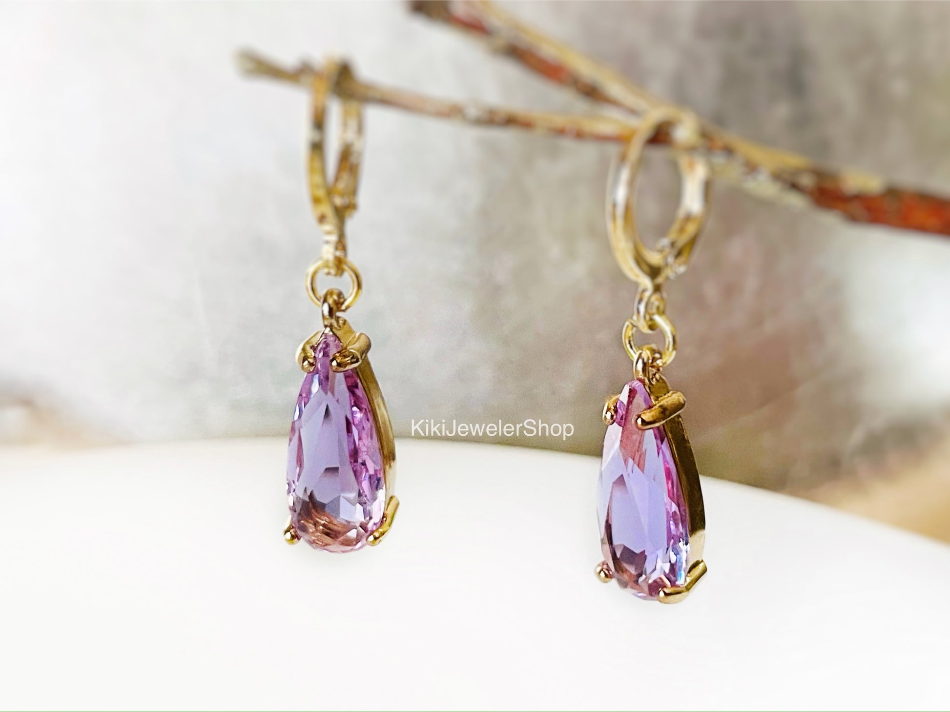 Elongated teardrop earrings featuring lilac amethyst gemstones set in 14K yellow gold plating over brass. Each earring showcases a 16x8mm elongated light purple gemstone. The surface is polished to a high luster and secured with lever back huggies.