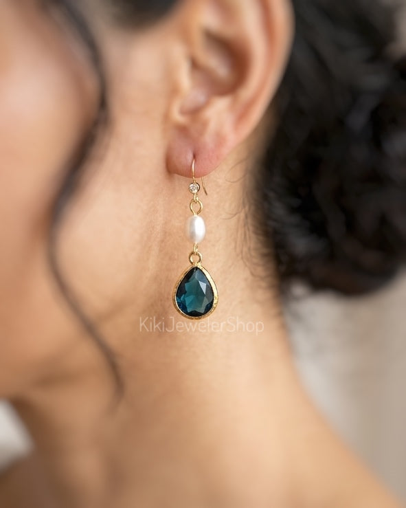 Long dangle earrings featuring white opal crystal pearls. These earrings consist of a white teardrop created gemstone (14x10mm) and white freshwater baroque pearls (7-8x5mm) suspended from French wire hooks, enhanced by small clear crystals set in 14K gold-filled settings for durability.