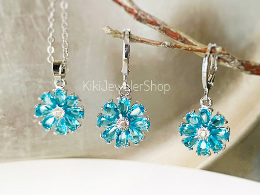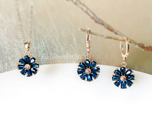 Sapphire flower dangle earrings, sapphire blue gemstone earrings necklace 2pc jewelry set, September birthstone earrings, gift for her