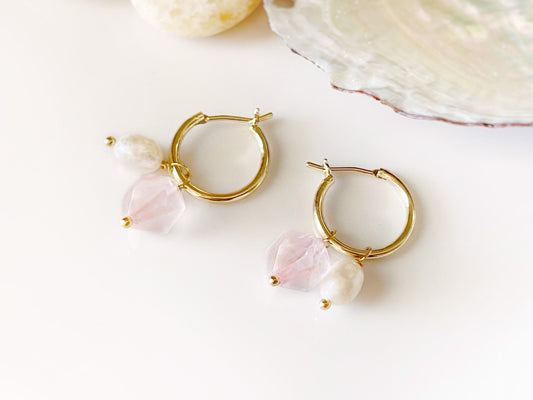 Rose quartz pearl gold hoop earrings
