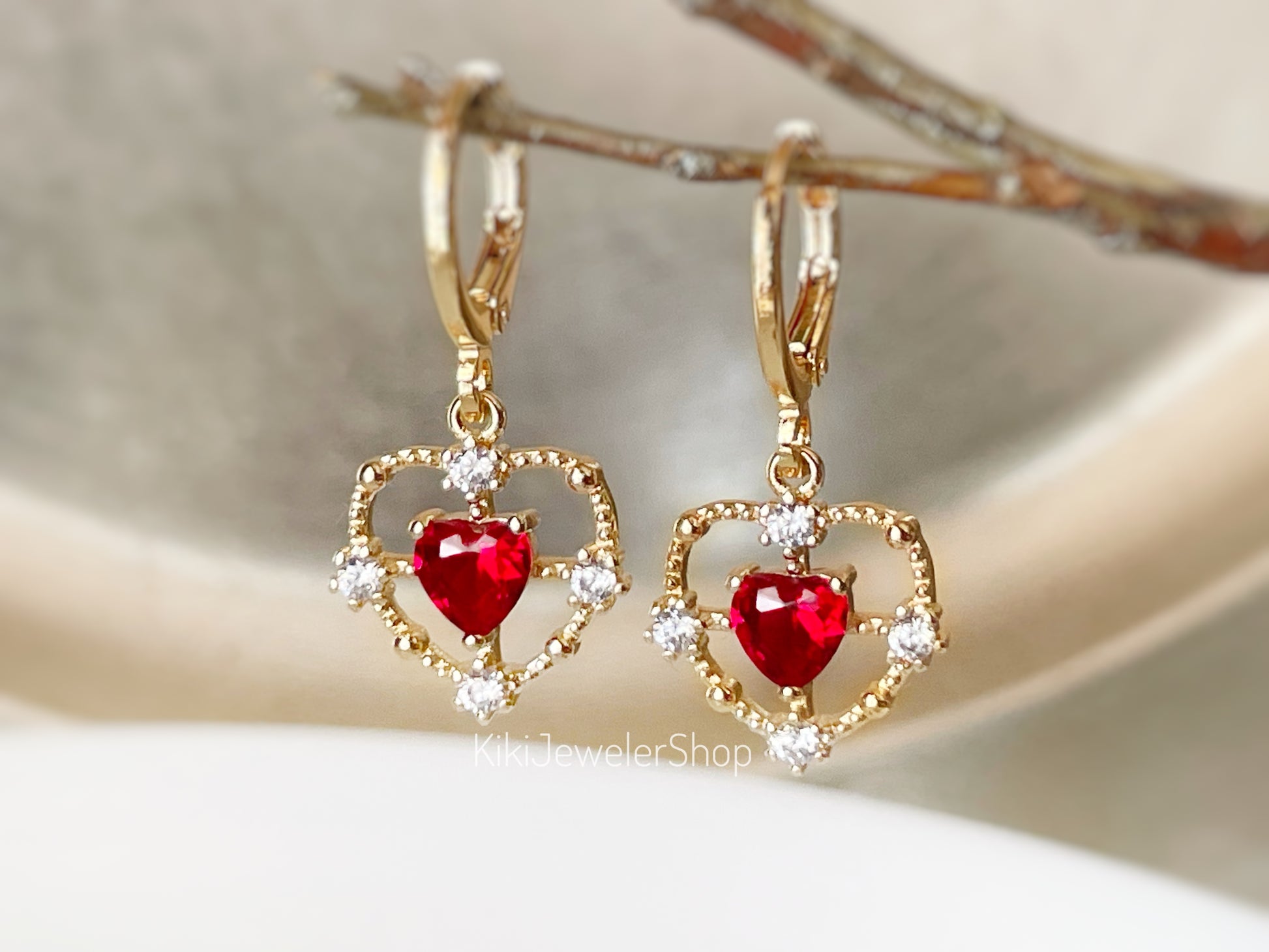 This elegant ruby heart dangle earrings is beautifully crafted with 14K gold-filled components and designed to celebrate love and timeless style. Each earrring featuring a faceted 5mm heart-shaped created ruby at the center. Surrounding the ruby are four sparkling white sapphires, adding brilliance and enhancing the delicate heart design.