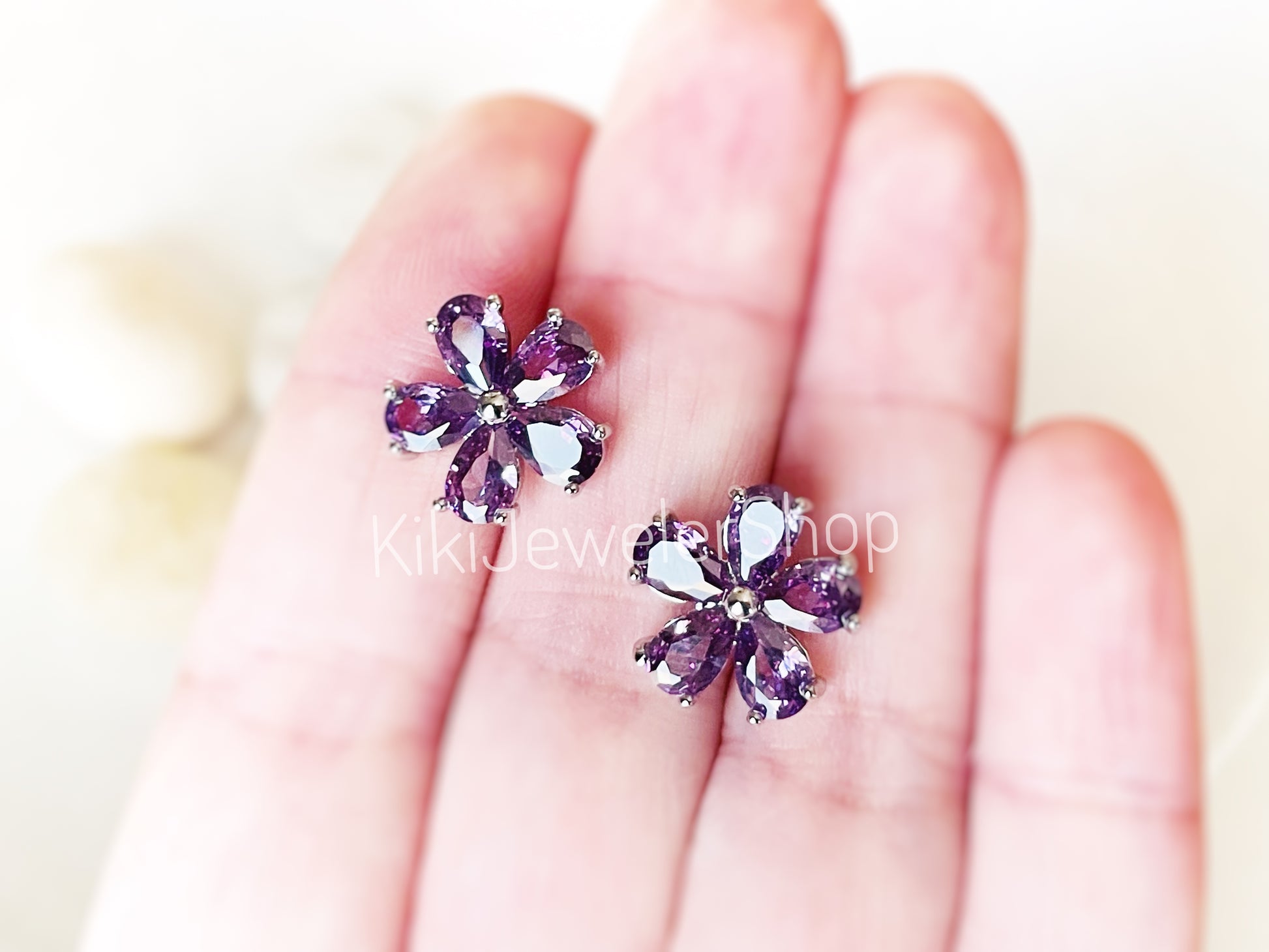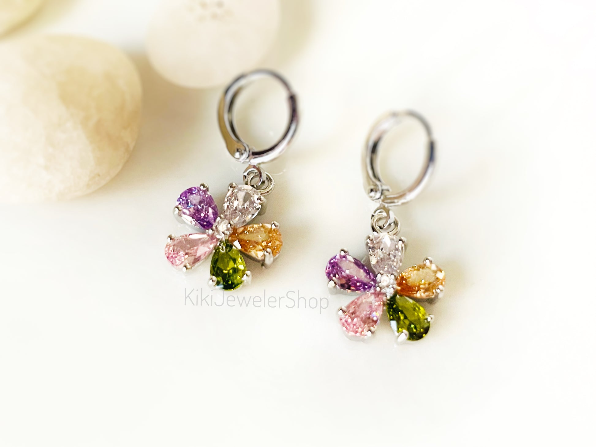 5 petal flower dangle earrings in real 18K white gold over brass. These beautiful earrings each has 5 (7x5mm) faceted pear shaped simulated gemstones with a 1mm white sapphire in the center. Each flower measures 0.5 inch. They are dainty and light weight.