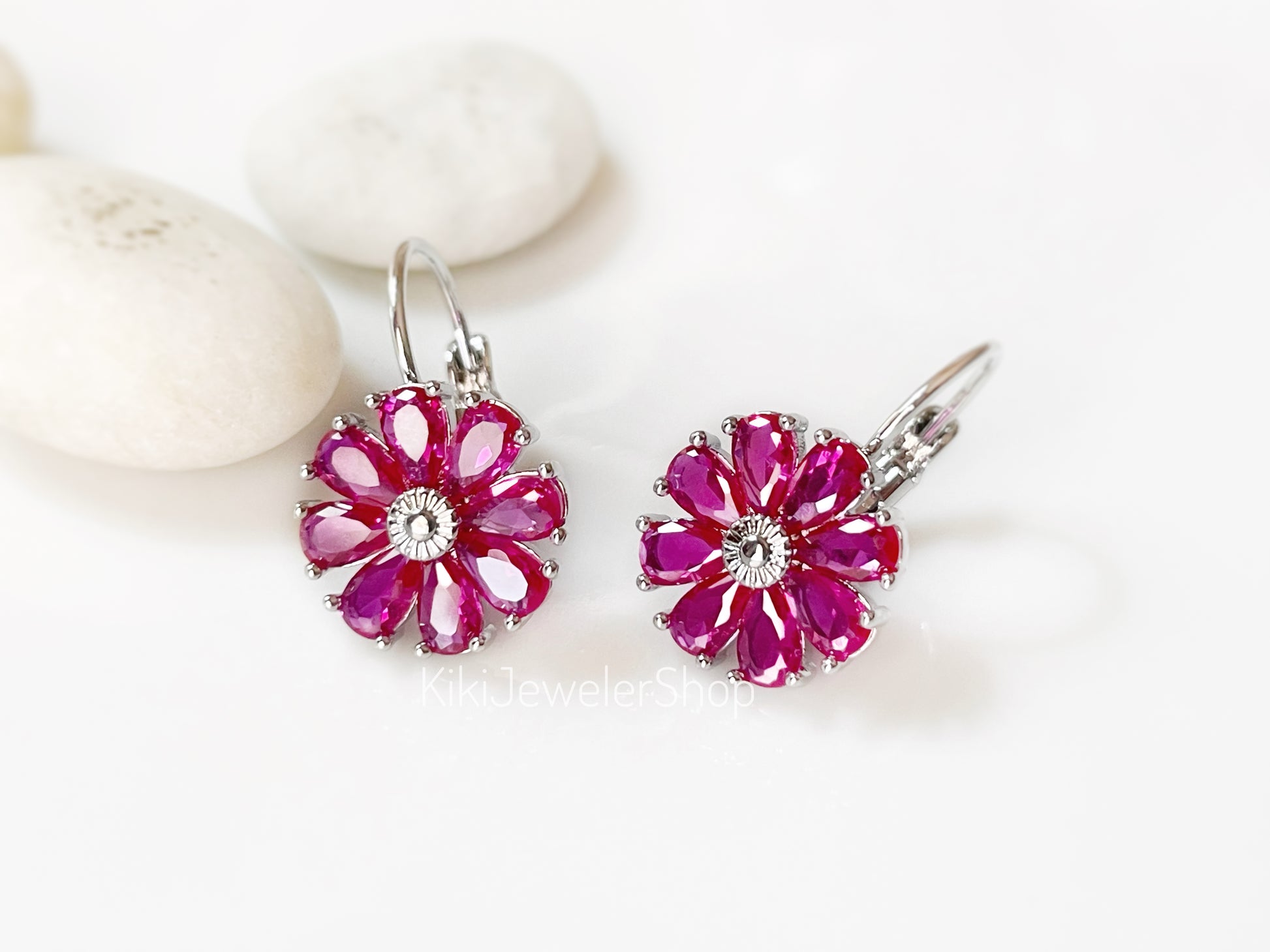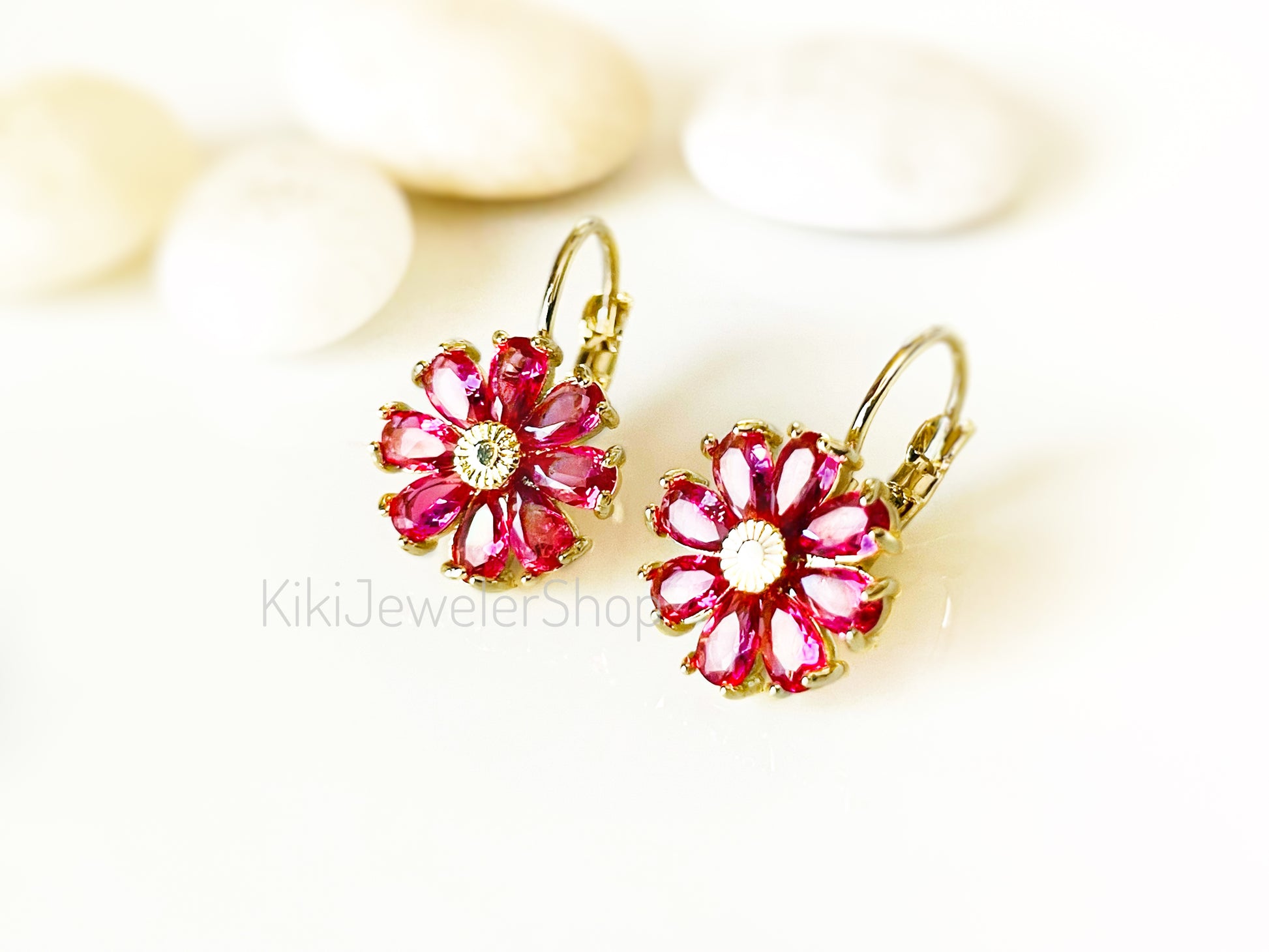 Pink tourmaline Dainty daisy flower gemstone dangle earrings lever backs. These created pink gemstone flowers are set in 14K gold filled, 14k rose gold filled and 18K white gold filled. Each daisy flower has 8 small pear shaped faceted stones with lots of sparkles.