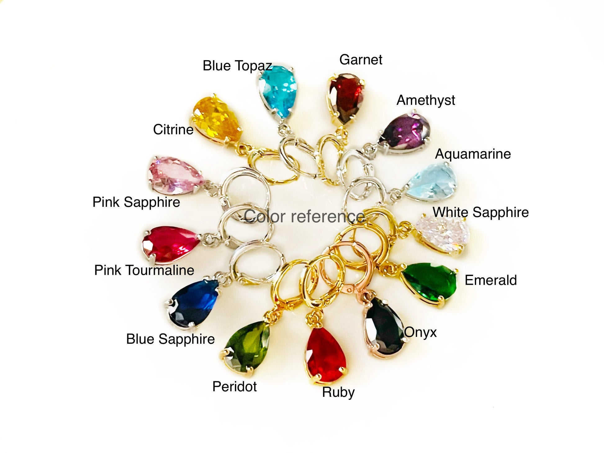 2-piece teardrop ruby jewelry set features red gemstone dangle earrings and a pendant necklace crafted in 14k gold, 14k rose gold, or 18k white gold filled. Each artificially created red gemstone measures 12x8mm and is faceted to enhance brilliance. This set is free from lead and nickel.