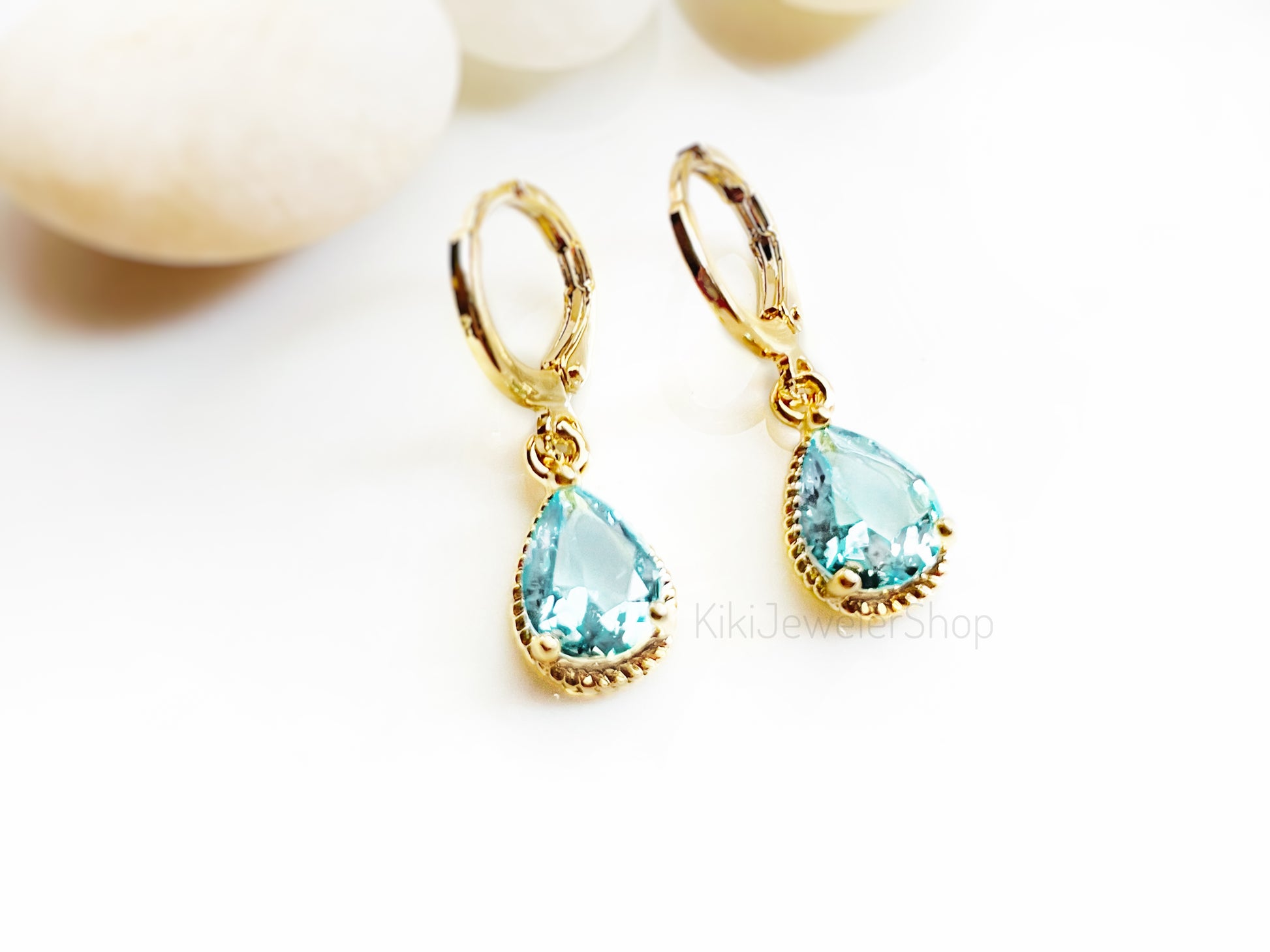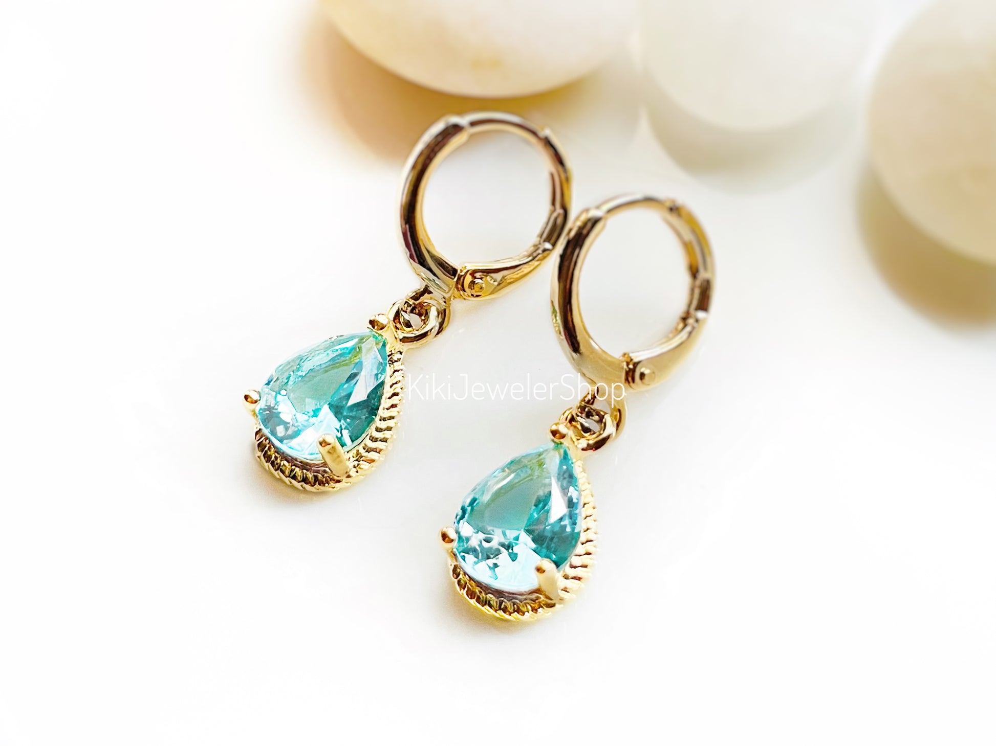 Boucles d'oreilles pendantes en laiton, serties d'une petite pierre d'aigue-marine en forme de larme, réalisées en or rose 14 carats, or jaune 14 carats ou or blanc 18 carats. Chaque boucle d'oreille est ornée d'une pierre de synthèse facettée de 10 x 7 mm. Sans plomb ni nickel.
