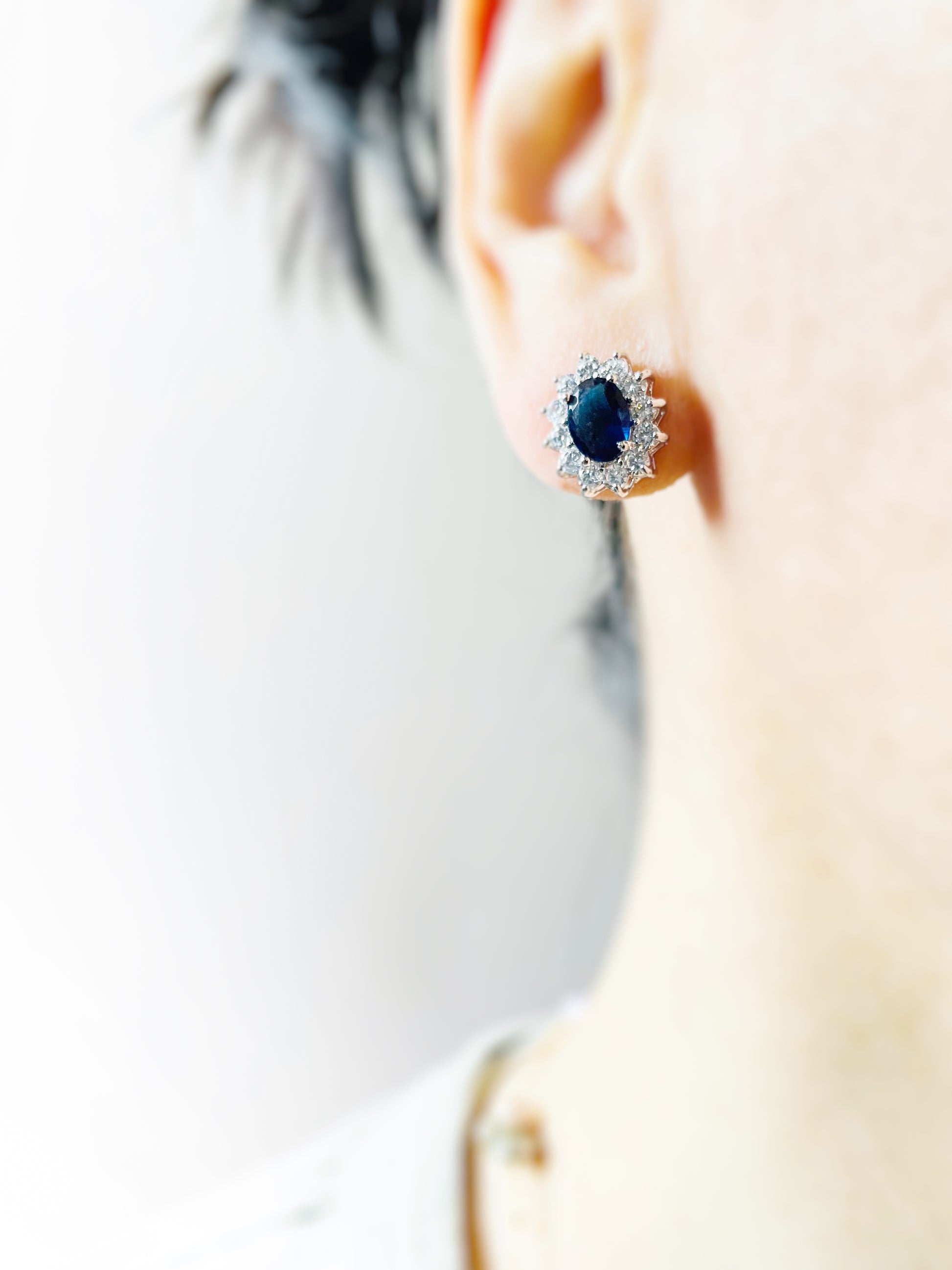 Boucles d'oreilles puces serties de grenats ovales rouge foncé de 9 x 7 mm, entourés de petits saphirs blancs de 1 mm. Ces ravissantes boucles d'oreilles sont en laiton plaqué or blanc 18 carats, sans plomb ni nickel, idéales pour les peaux sensibles. Un style classique et raffiné, parfait pour toutes les occasions.