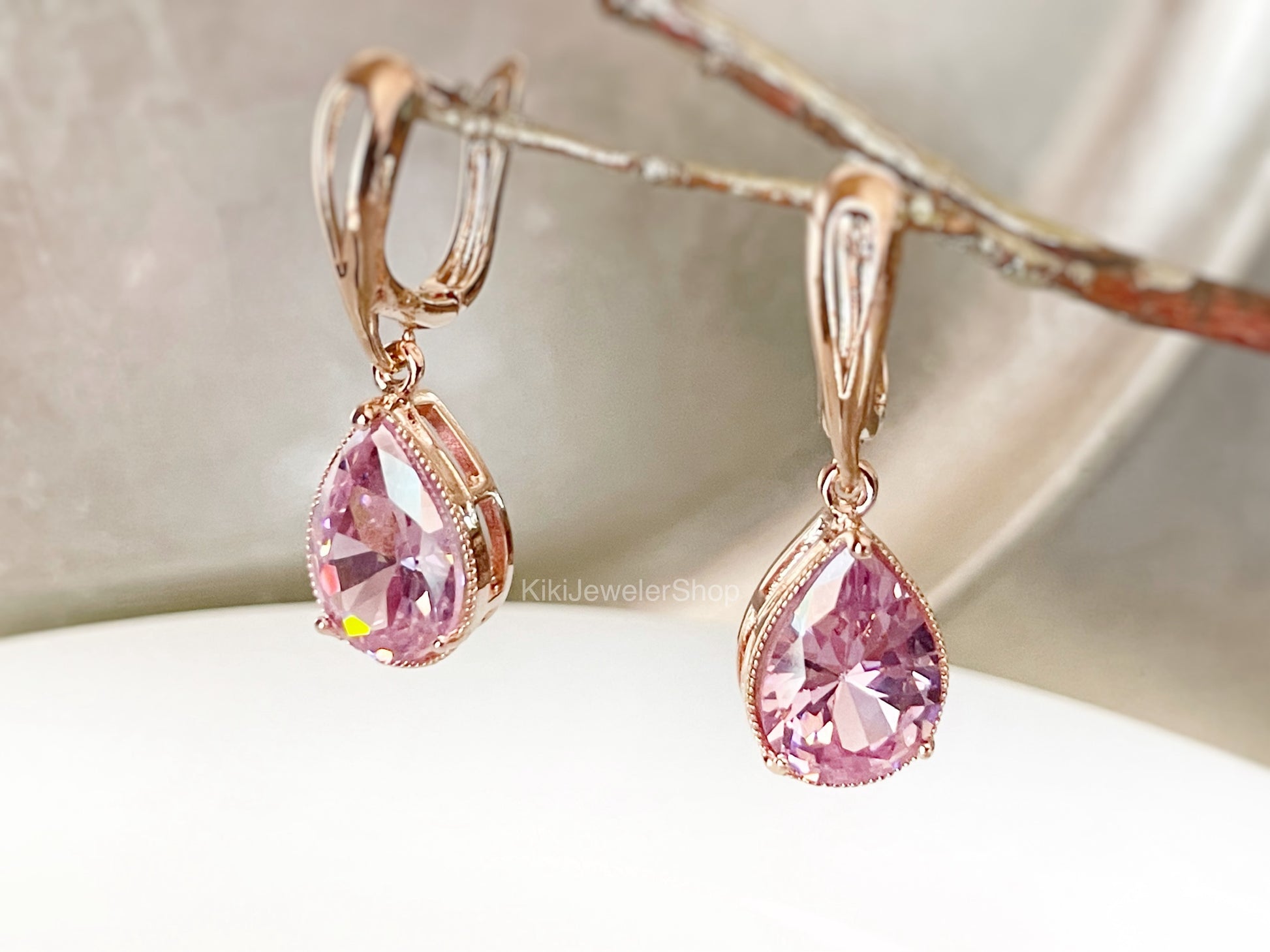 Boucles d'oreilles pendantes en forme de larme, ornées de saphirs roses de synthèse, réalisées en laiton plaqué or rose 14 carats, or jaune 14 carats ou or blanc 18 carats, et fermées par un fermoir à levier. Ces saphirs roses de synthèse sont facettés pour un éclat maximal. Parfaites pour une élégance du matin au soir, elles constituent un cadeau idéal pour les femmes nées en octobre ou pour vos demoiselles d'honneur.