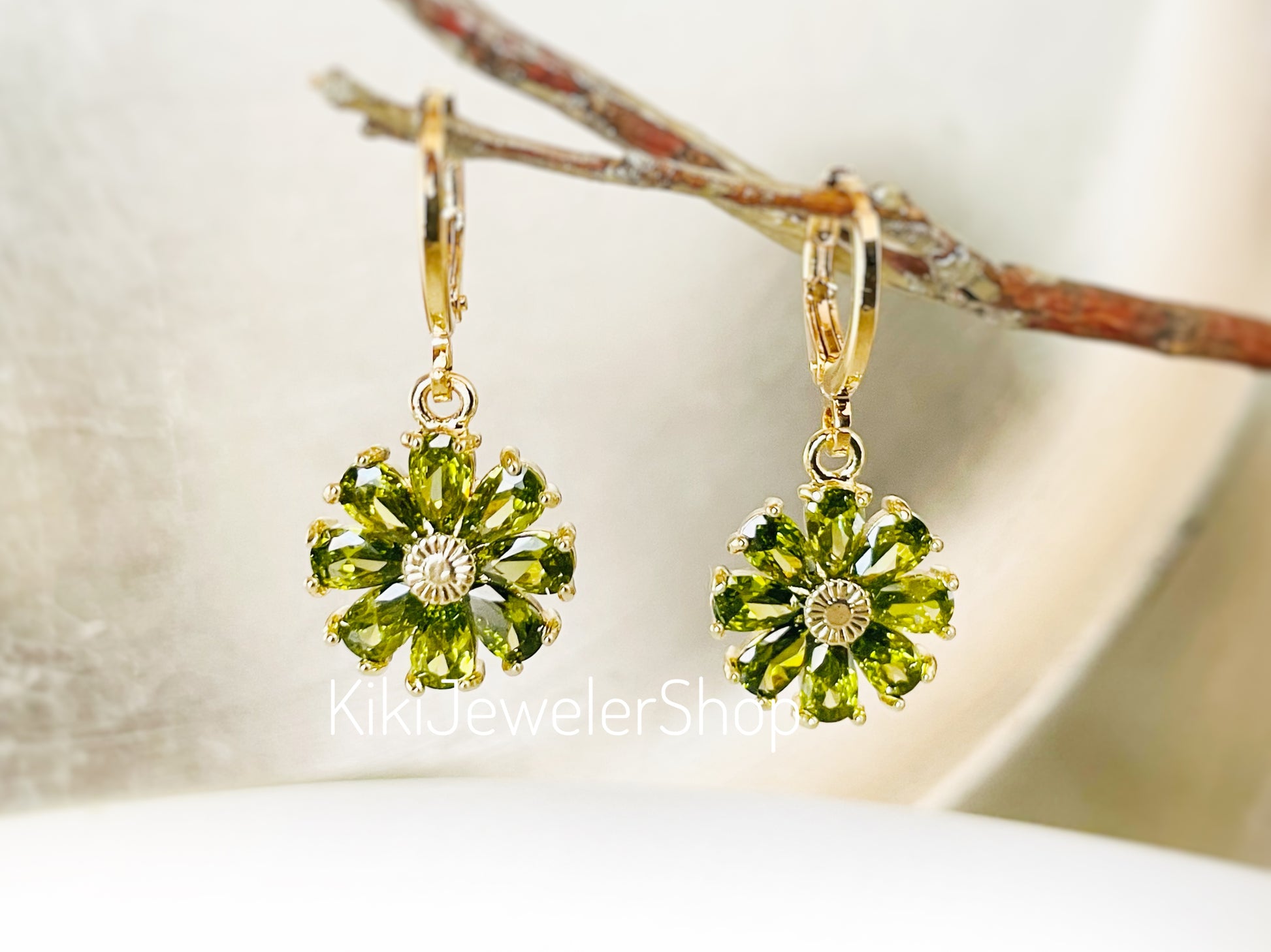 Boucles d'oreilles pendantes en péridot, pierres précieuses vert olive en forme de marguerite, cadeau pour maman, cadeau pour elle, pierre de naissance d'août