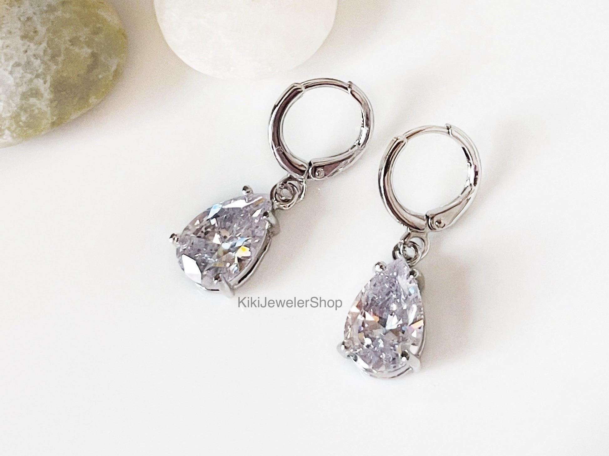 Boucles d'oreilles pendantes en saphir blanc, pierres précieuses blanches, cadeau pour elle, boucles d'oreilles de mariée, pierre de naissance d'avril