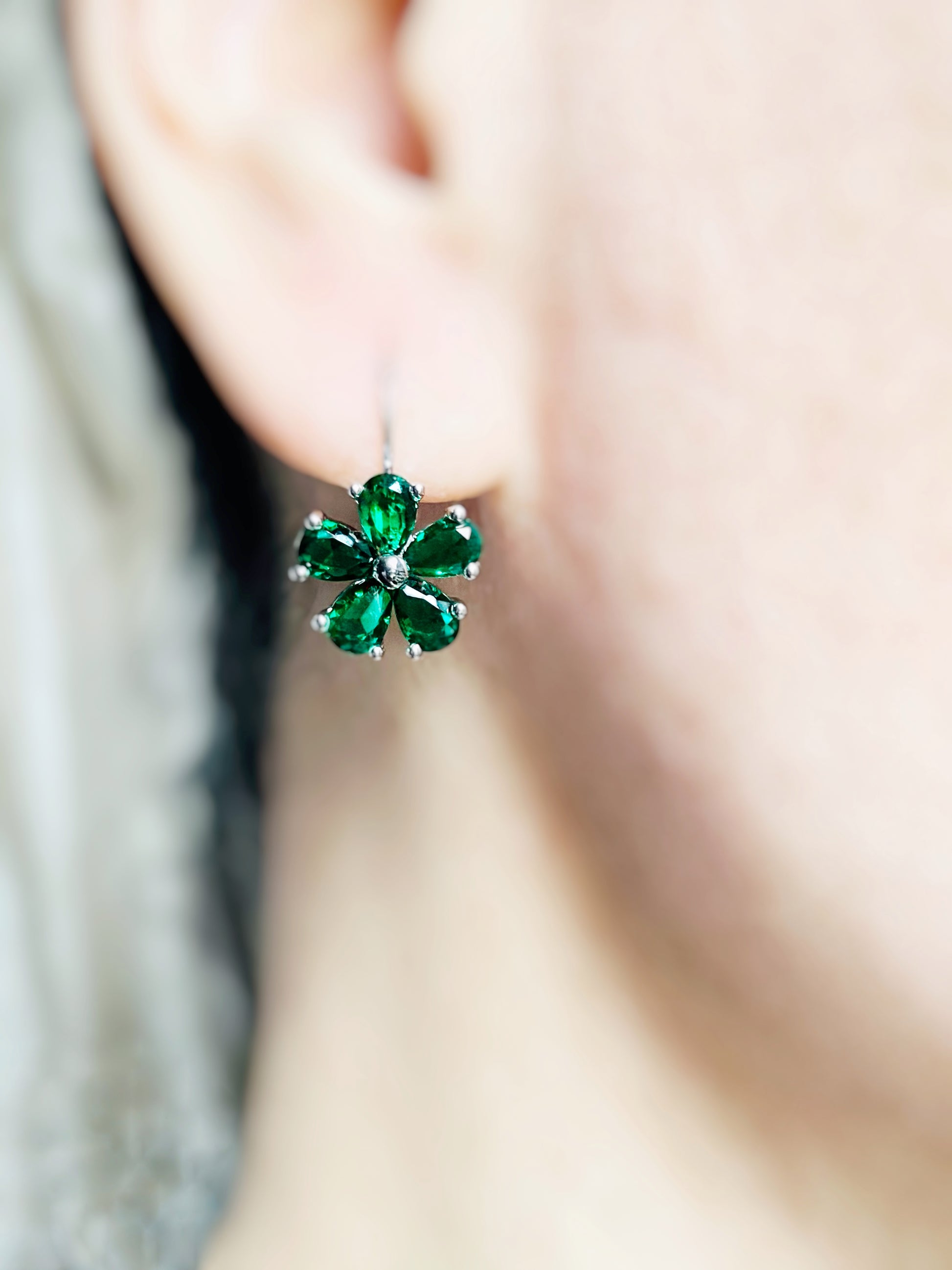 5 petal flower dangle earrings in real 18K white gold over brass. These beautiful earrings each has 5 (7x5mm) faceted pear shaped simulated gemstones with a 1mm white sapphire in the center. Each flower measures 0.5 inch. They are dainty and light weight.
