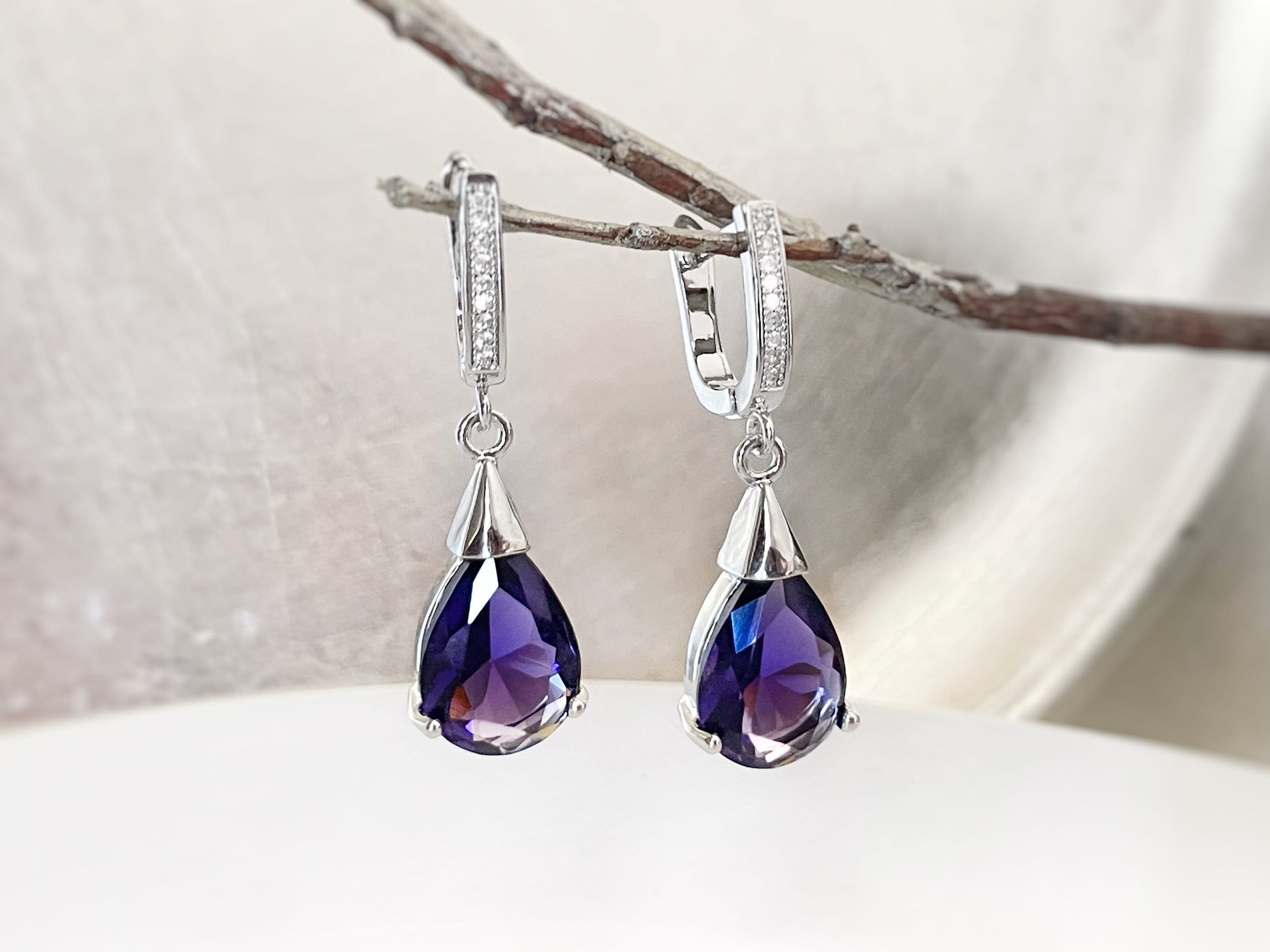 Amethyst teardrop dangle earrings, purple gemstone drop earrings, gift for her, gift for mom, purple bridal earrings, February birthstone