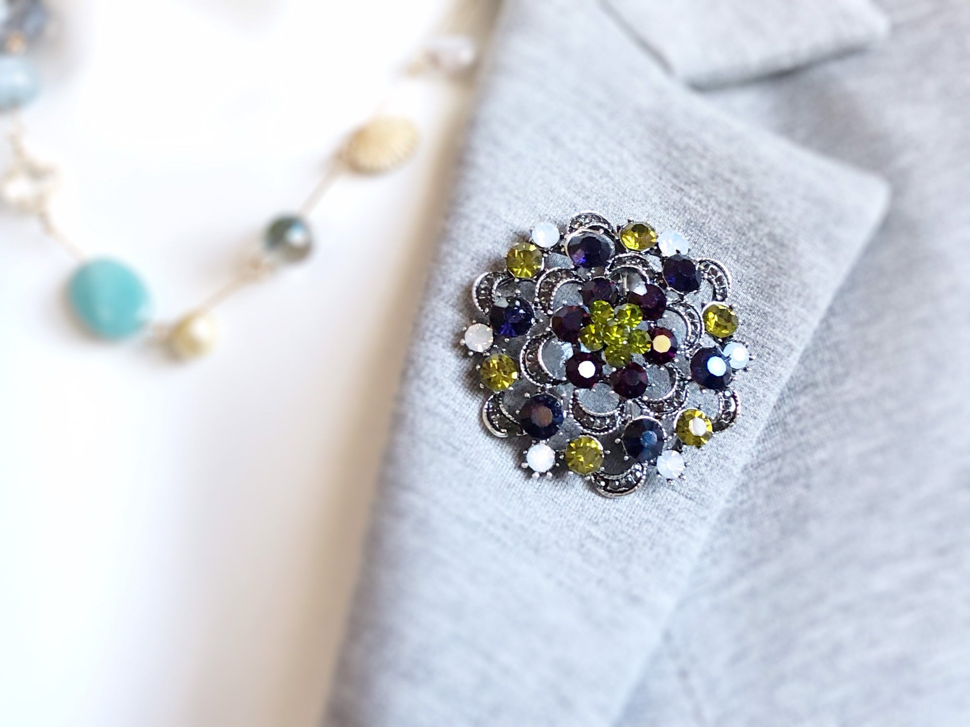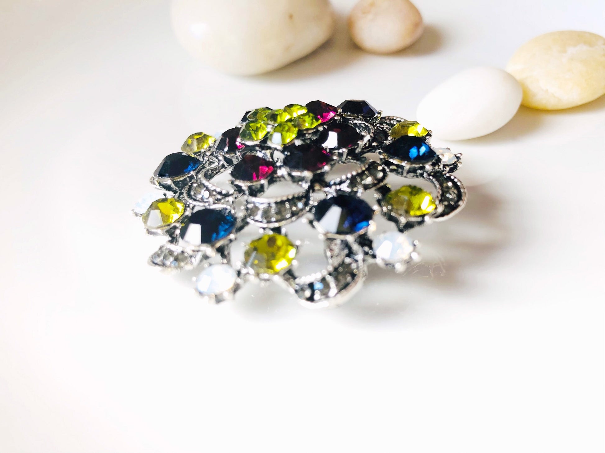 Antique silver crystal brooch pin, multicolor green blue crystal bouquet brooch, gift for her, gift for mom