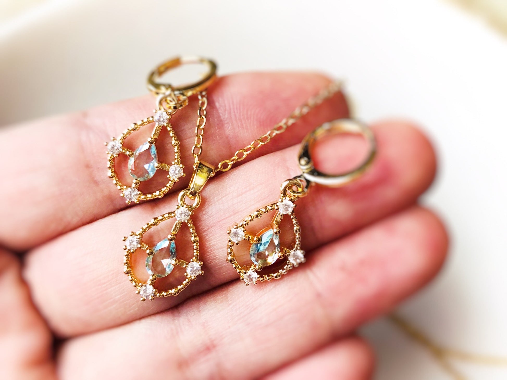 Two piece created aquamarine and white sapphire jewelry set in 14K gold filled over brass. Allergy and nickel free. Perfect gift for March birthday girls.