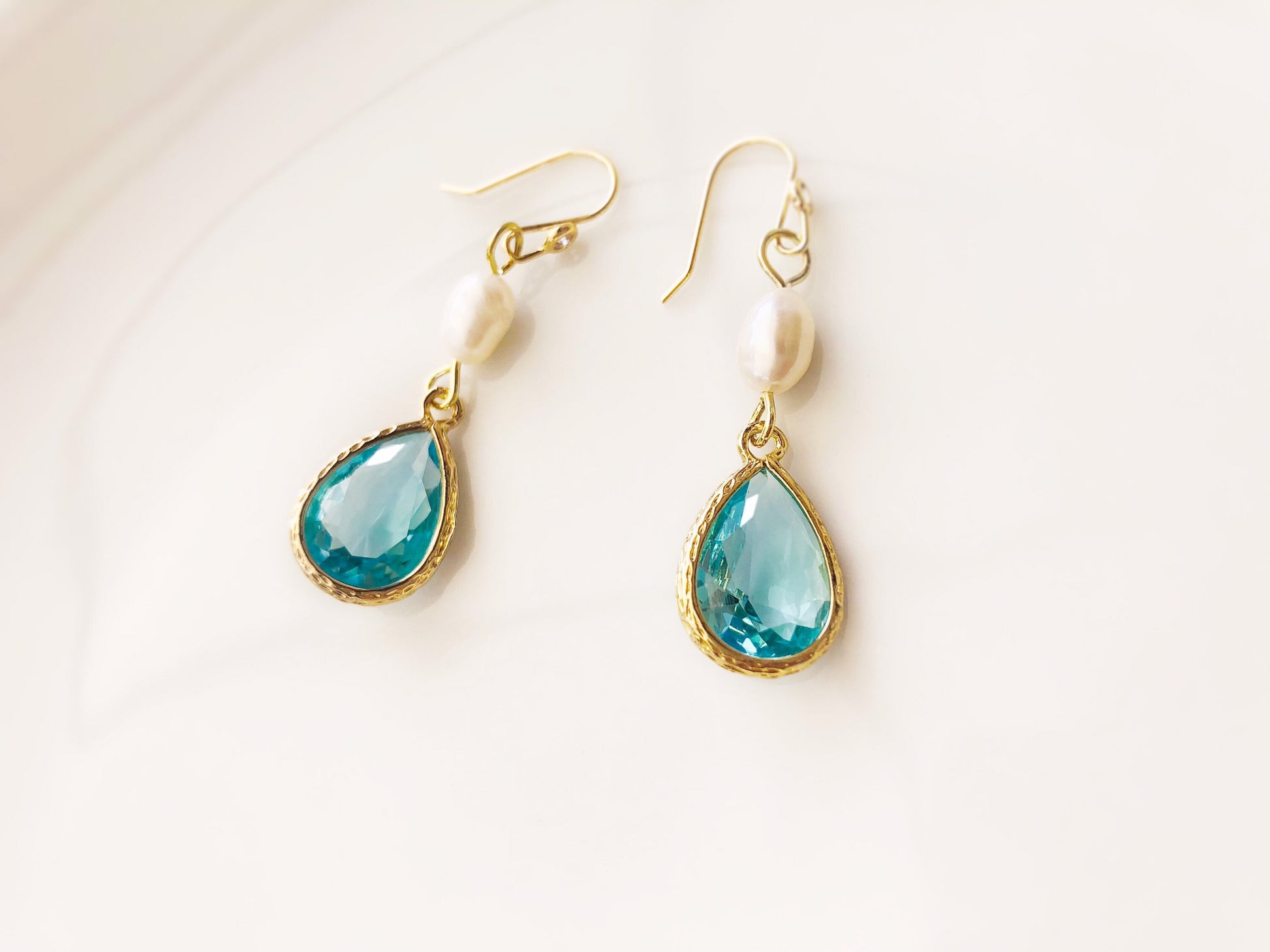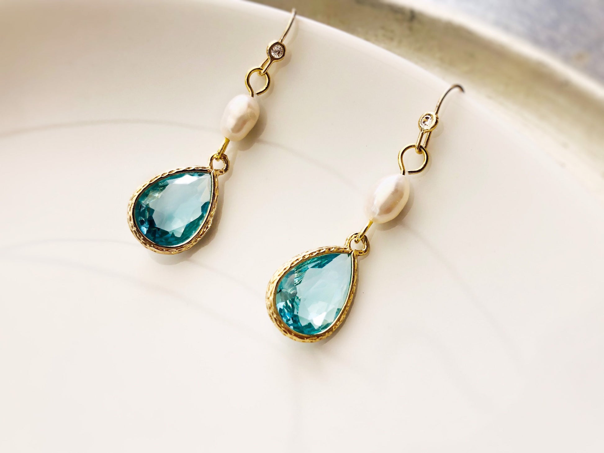 Beautiful dangle earrings in aquamarine blue CZ crystals ( 15x10mm) in teardrop cut and white genuine pearls (8x5mm) suspended from French wire hooks with small clear crystals set in 14K gold filled for lasting wear. These earrings are perfect for your bridesmaids!
