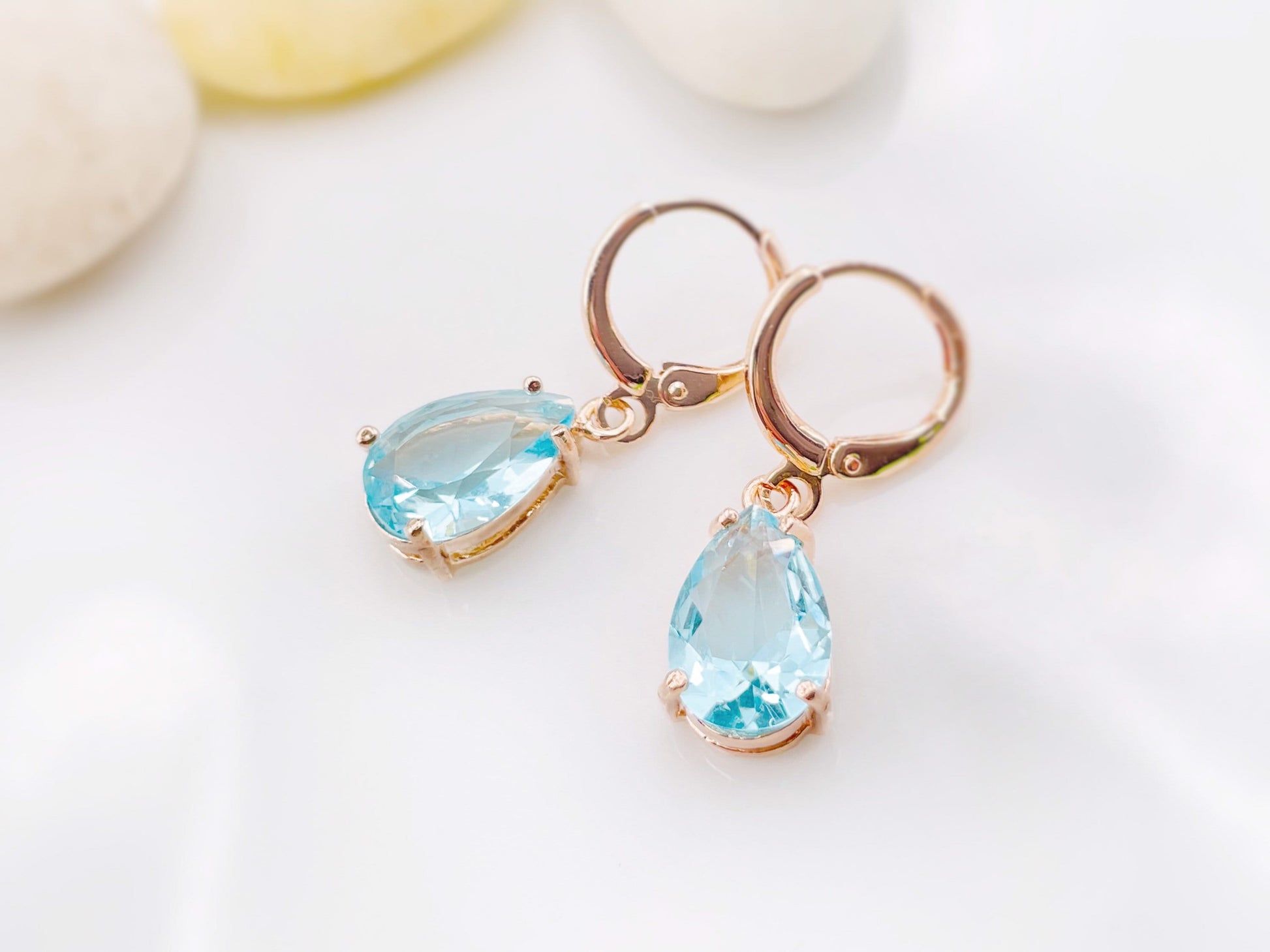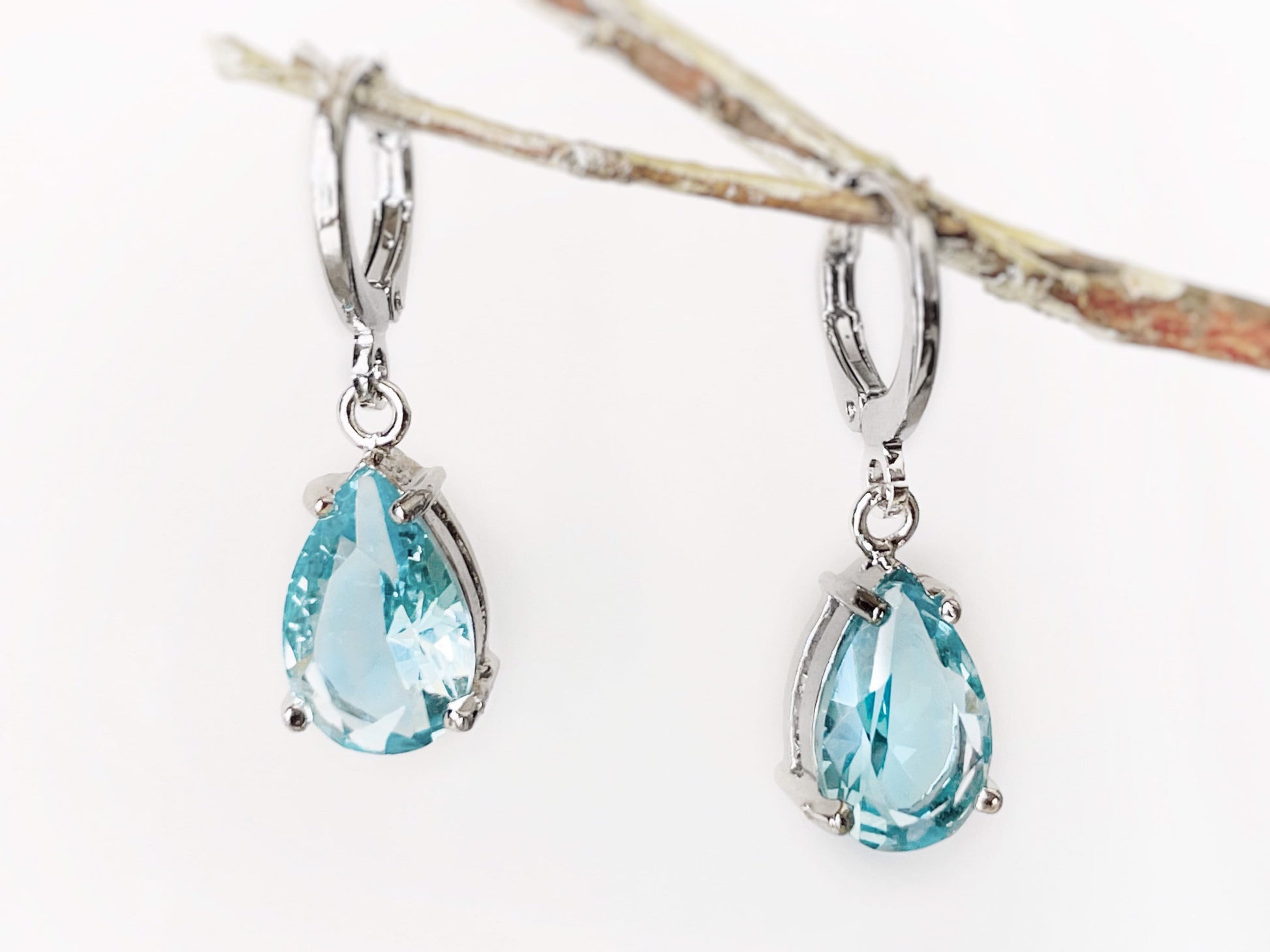 Created aquamarine teardrop dangling earrings in 14k yellow gold / 18k white gold / 14k rose gold over brass, each earring dangle features a 13.0 x 8.0mm in size. Polished to a bright shine.