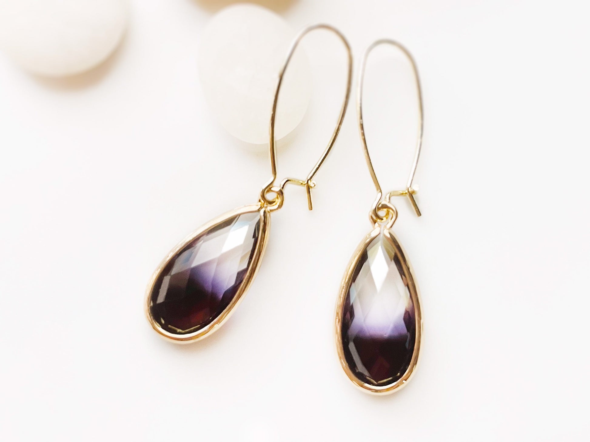 Bicolor black crystal earrings crafted in 14K gold over brass dangling from 1” gold filled kidney wires or 1” circular hoops. Each earring dangle features elongated faceted 20x10mm teardrops in beautiful gradient clear to black with a tint of purple for more depths.