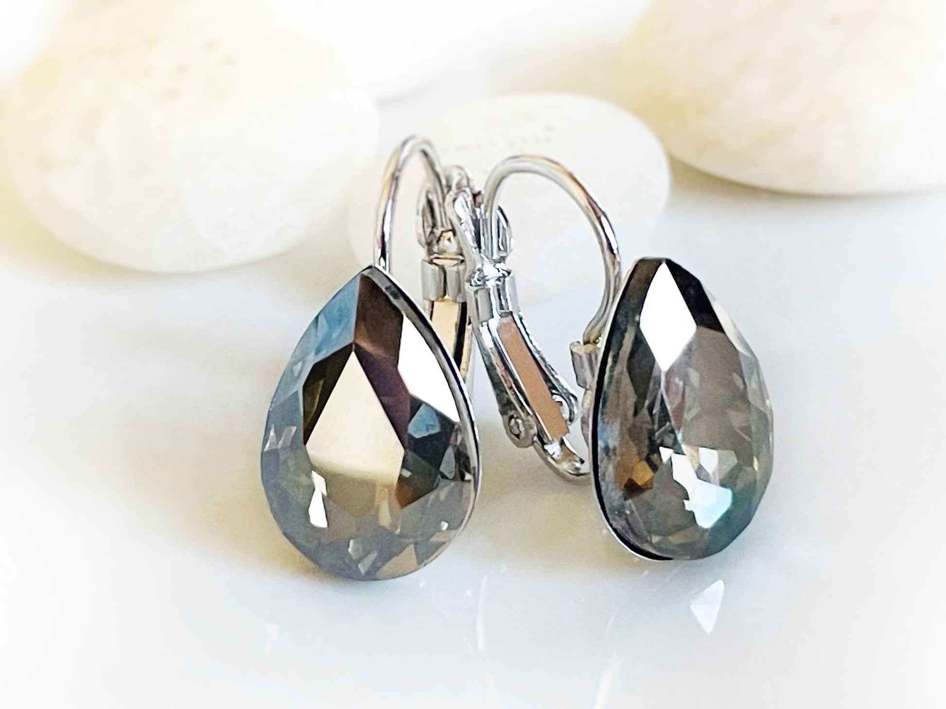 Black Diamond fancy crystal leverback stud earrings, teardrop crystal studs, black solitaire stud lever backs, gift for mom, bridal earrings