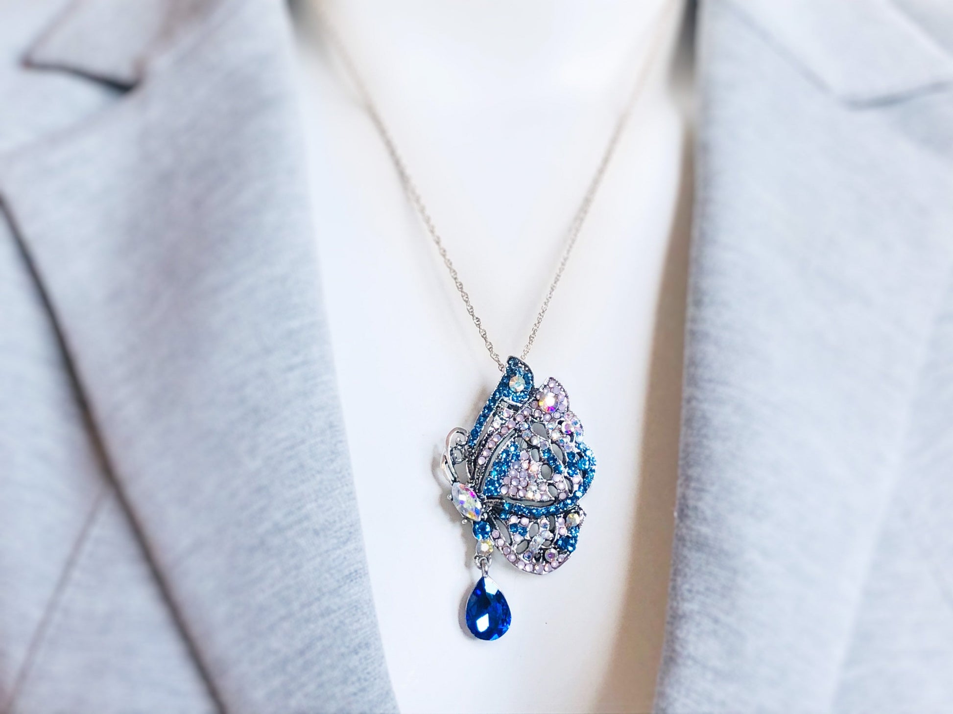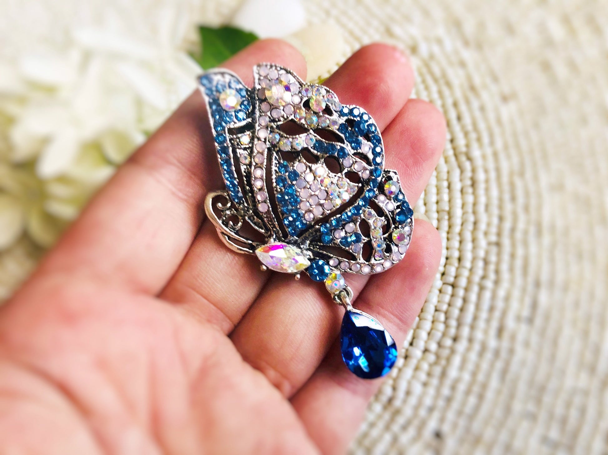 Beautiful blue crystal encrusted butterfly brooch is a statement maker of any outfit in any occasion! It can be use as a pendant. The crystals come in different size and colors.