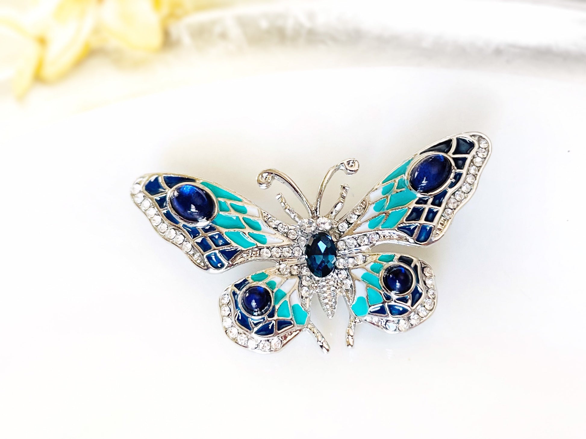 Blue crystal enamel butterfly brooch pin, wedding bouquet brooch. Gift for her, gift for mom