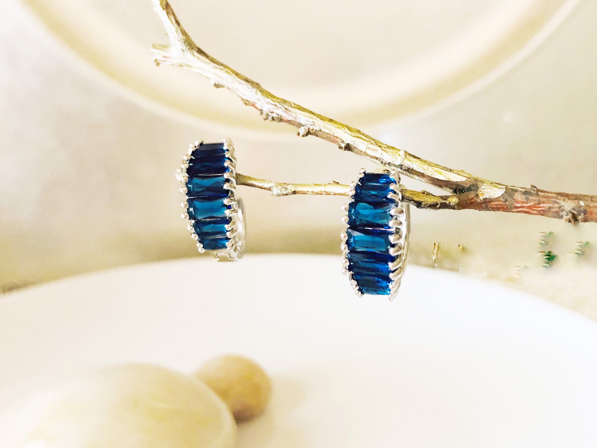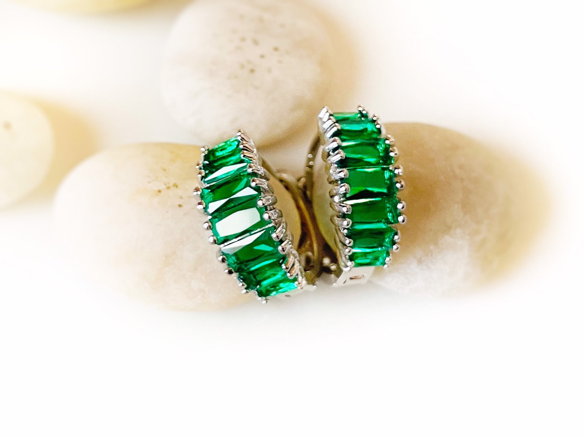 7 baguette created blue sapphire, white sapphire, emerald green gemstones sparkle on 18k white gold over brass hoop earrings that instantly elevate your everyday style.