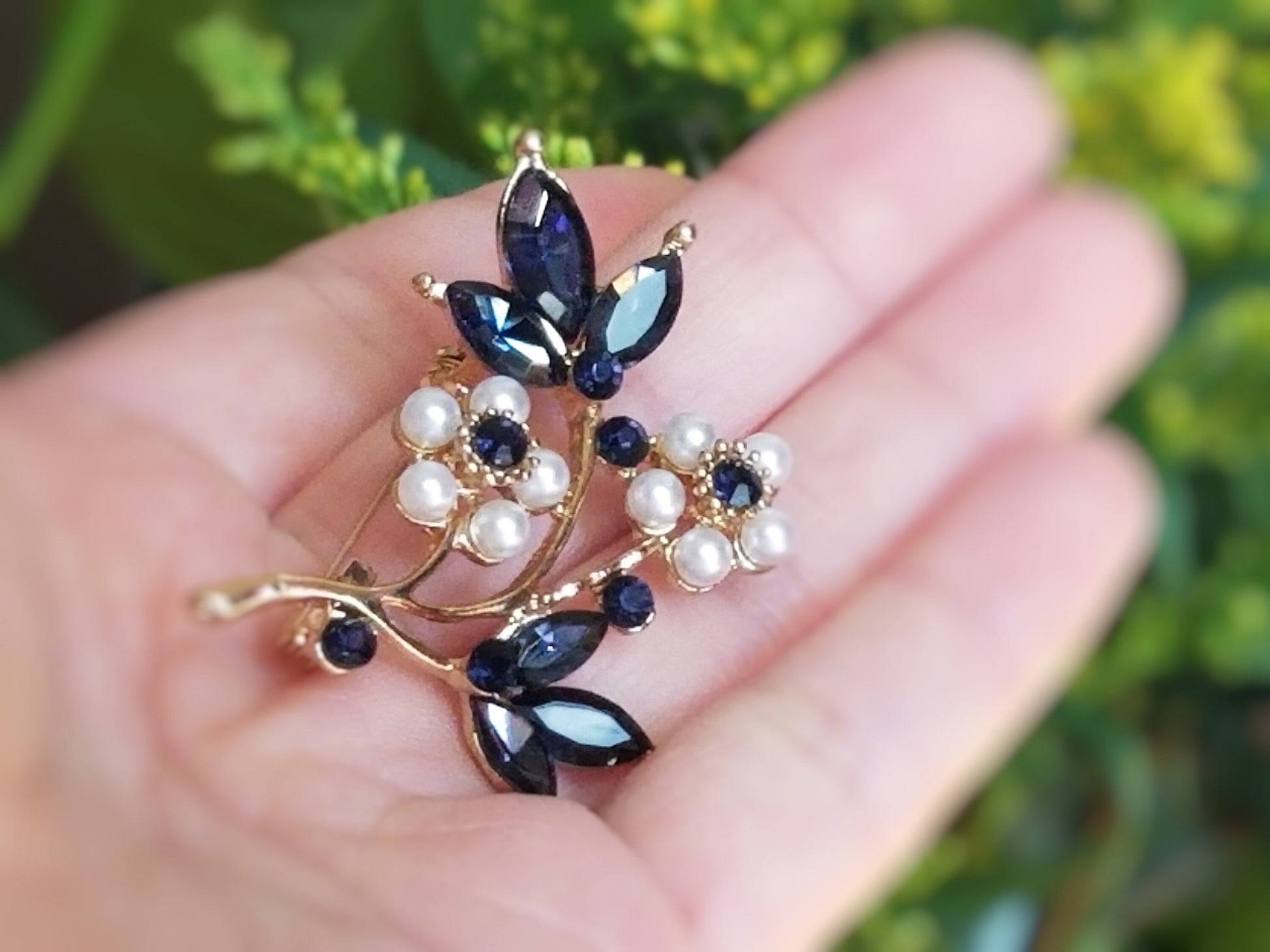 Blue sapphire pearl brooch, flower brooch pin, wedding brooch, gift for mom, gift for her